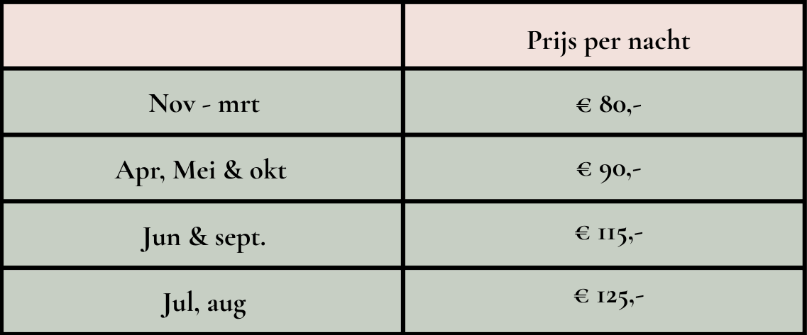 *Sinds 1 juni 2023 zijn wij verpicht om toeristenbelasting te innen. De tarieven zijn als volgt: